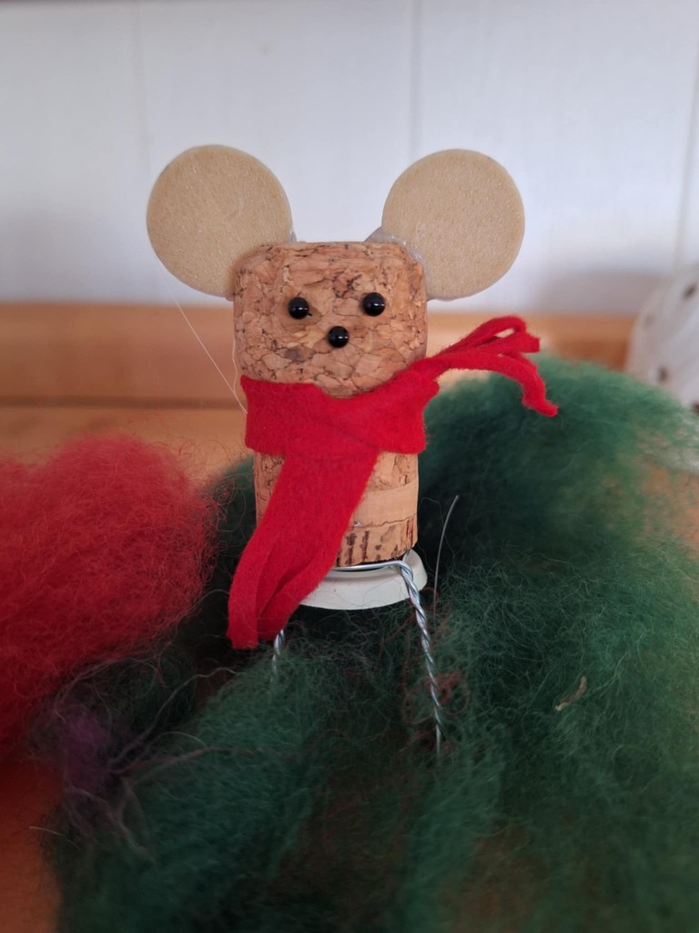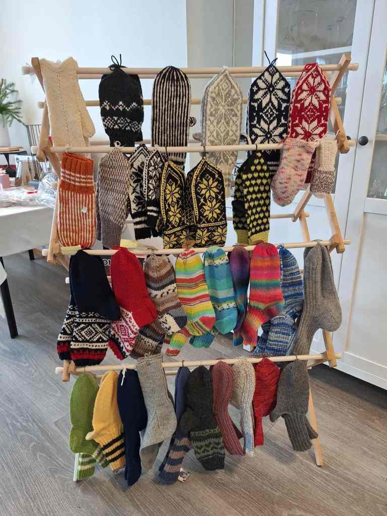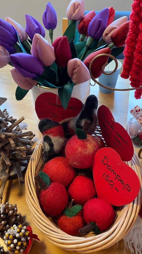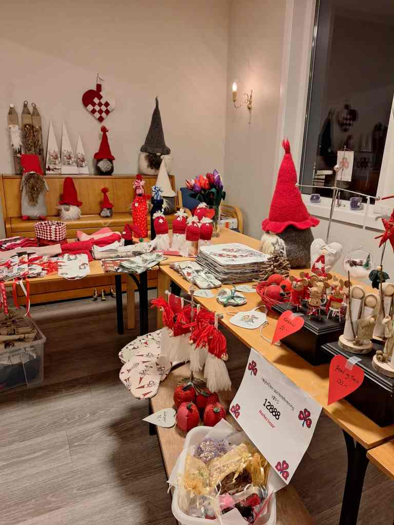 Basaren har en flott salgsdisk med forskjellig håndarbeid som er laget av flittige medlemmer i sanitetsforeningen.
